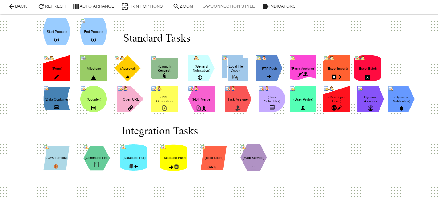 Tasks are the building blocks of processes. Simply put, tasks represent a unit of work or distinct action. Standard tasks may present a user with a form, allow a person to approve or reject a request or send an email notification to a user or group of users. Our more advanced, Integration Tasks, can push or pull data to/from external databases or create an interface with other systems and data sources throughout an organization.